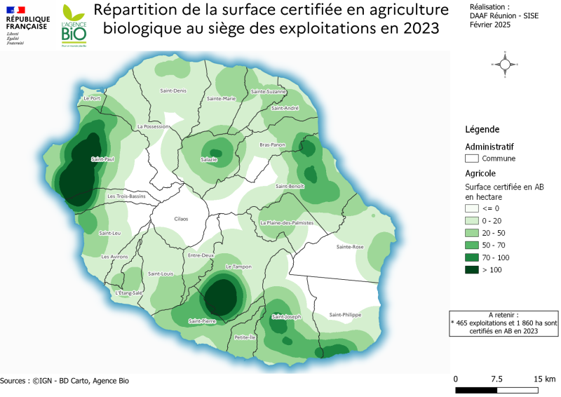 Répartition de la surface certifiée en Agriculture Bio au siège des exploitations en 2023